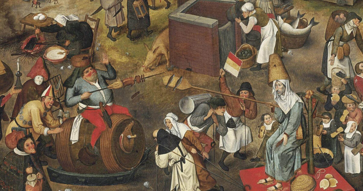 Le Carnaval est généralement défini comme une fête rituelle de travestissement, d’abondance alimentaire et de libations et dont la date, de nos jours, est relativement variable : généralement entre l’épiphanie et le mercredi des Cendres. D’où l’interprétation courante de Carnaval : c’est une fête préparatoire au Carême. D’où encore l’interprétation de son étymologie : Carne levare, signifiant littéralement « enlever la viande », s’impose sans choquer… alors même que Carnaval est une période d’abondance de viande, et particulièrement de cochonnailles ! (Jetez un œil sur l’affiche ci-dessus : Brueghel personnifie carnaval en ce personnage rond (enflé) visiblement amateur de viande porcine !)