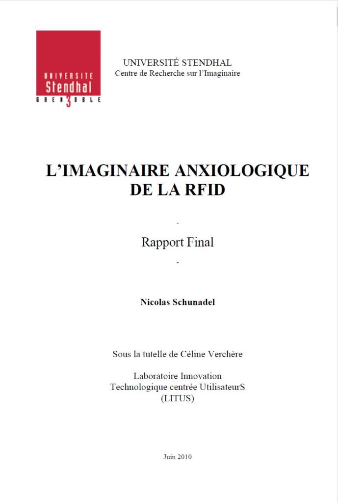 | Nicolas Schunadel, L’Imaginaire anxiologique de la RFID, Rapport pour l’Université Stendhal Grenoble III, Grenoble, 2010, 198 pages. | ![]() |