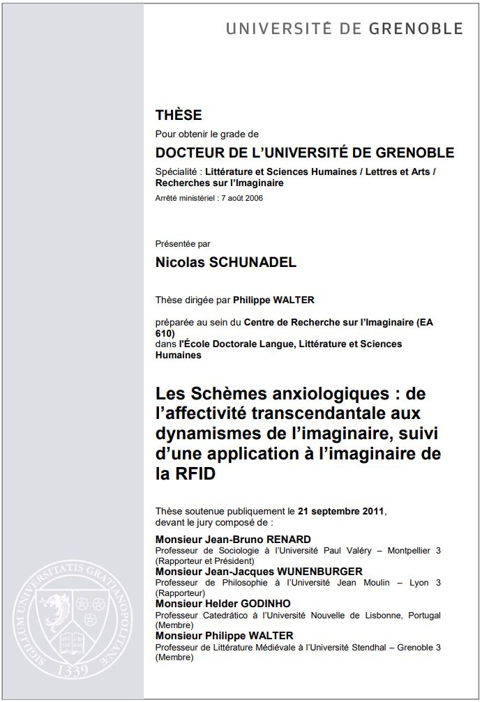| Nicolas Schunadel, Les Schèmes anxiologiques : de l’affectivité transcendantale aux dynamismes de l’imaginaire, suivi d’une application à l’imaginaire de la RFID, Thèse de doctorat, Université Grenoble-Alpes, 2011, 452 pages. | ![]() |